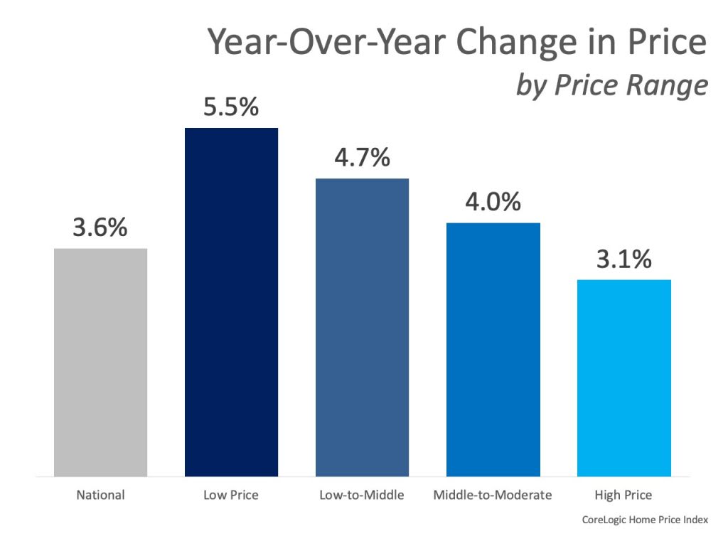 Price appreciation can differ depending on your price range. CoreLogic analyzed four individual home prices tiers and shares the increase in each one.