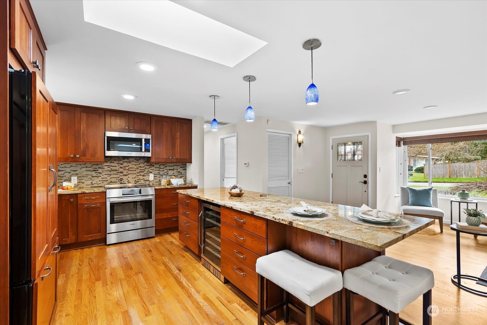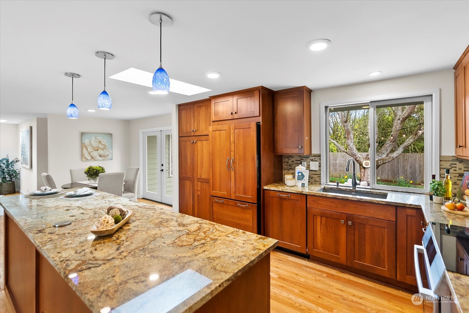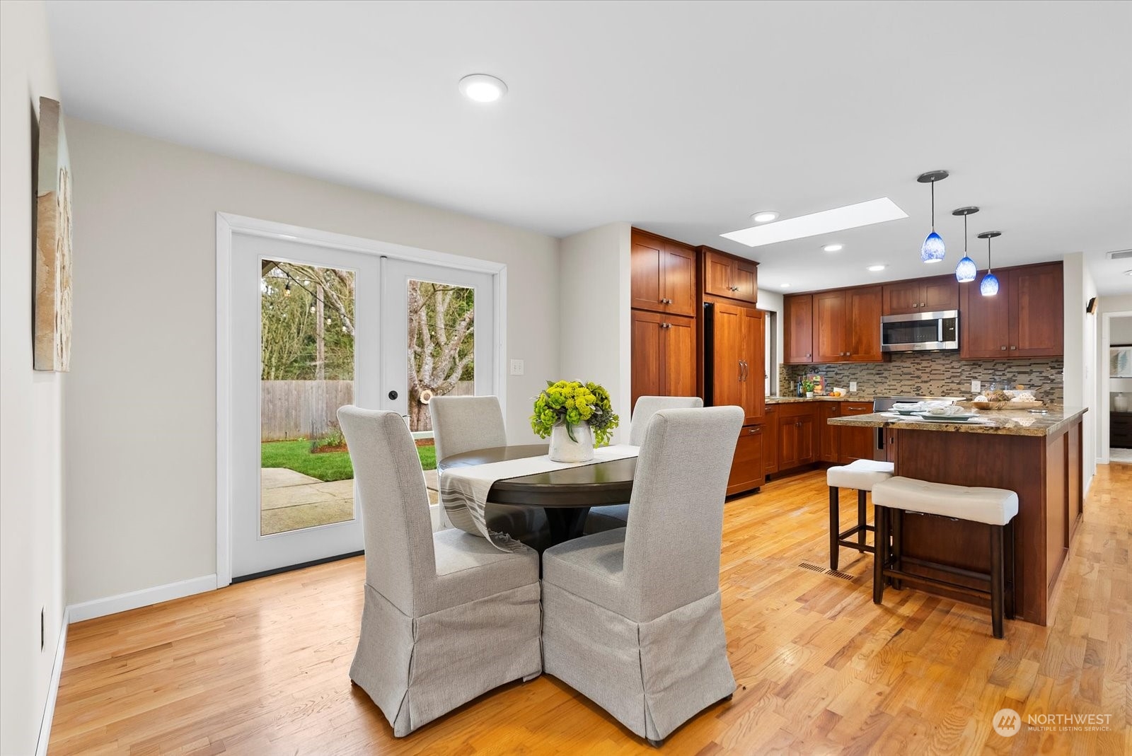 Beautifully remodeled rambler in Bellewood East features an open floor plan that's ideal for comfortable living & entertaining. Living room with gas fireplace. Kitchen w/cherry wood cabinetry, island & upgraded stainless-steel appliances. Formal dining room + kitchen eating area. There are 4 bedrooms & 2.5 baths. Primary suite w/vaulted ceiling with a skylight, double closets, French doors to the back yard & luxe 3/4 bath with a dual-sink vanity, shower & heated towel rack. Fully fenced peaceful backyard retreat with a spacious patio and deck - a great place to BBQ & relax! Great location close to Ardmore Park & Interlake High School. Easy proximity to Crossroads & Overlake shopping, Microsoft, Amazon, DT Redmond, Bellevue and SR-520.