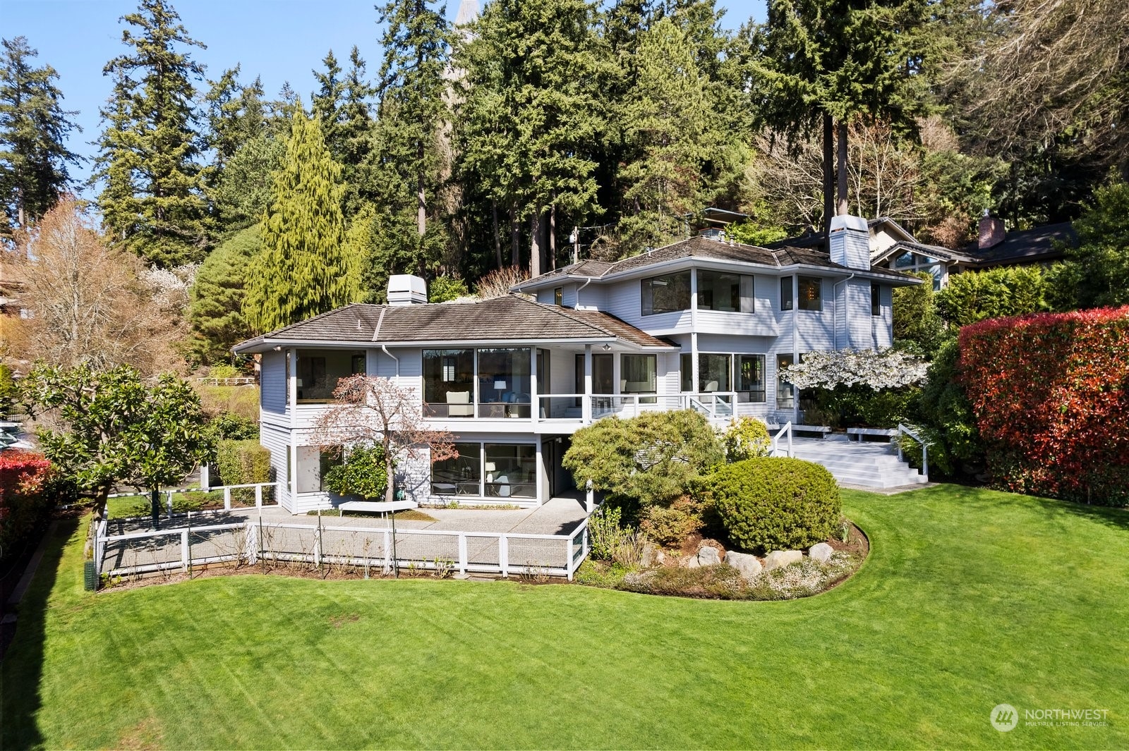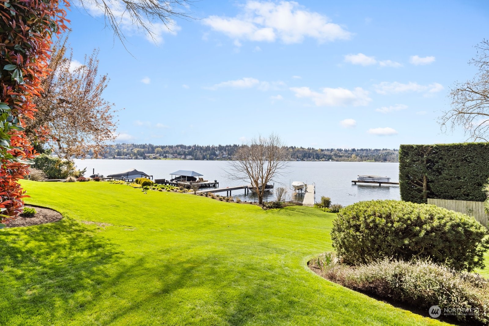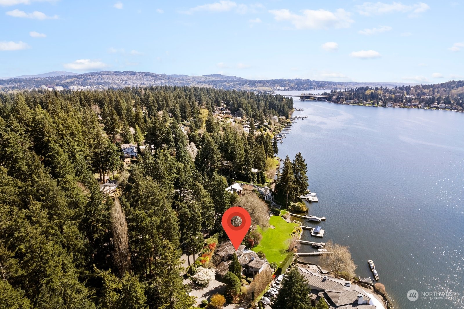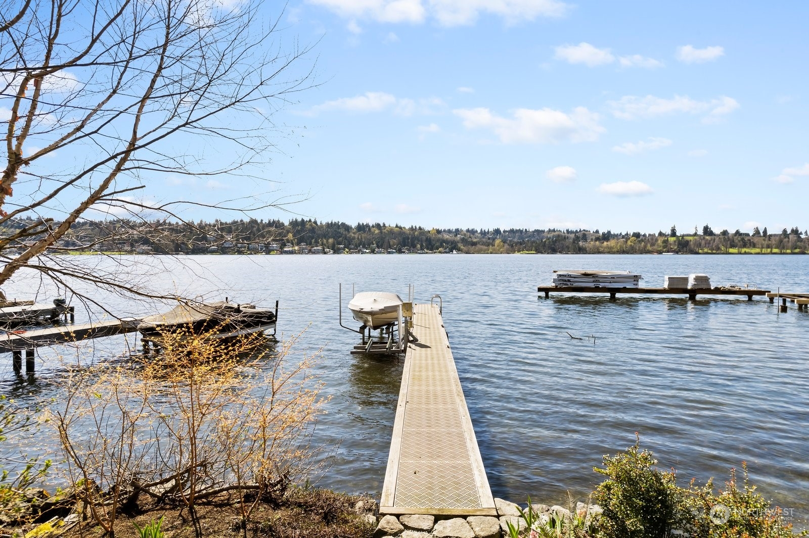 Enjoy refined lakefront living in this Northwest contemporary home built by Design Guild. 43' of prime, southwest facing no-bank waterfront with sandy beach, newer 71' dock w/6,000 lb. boat lift. Expansive windows maximize the light and captivating views. Designed for gathering, the main floor has formal living and dining rooms, open-concept kitchen, family room + den/office. Upper level w/primary suite w/lake views & 5-piece bath. Additional upper level bedroom with 1/2 bath. Daylight lower level w/rec-room, 3 bedrooms, 1.75 baths, media room & 2nd kitchen. 22,276 sf lot w/expansive decks, patio, sport court & lush sprawling lawn. 3-car garage + 4th gar & parking for 10-12 cars. Just minutes to Bellevue, parks, shopping and restaurants.