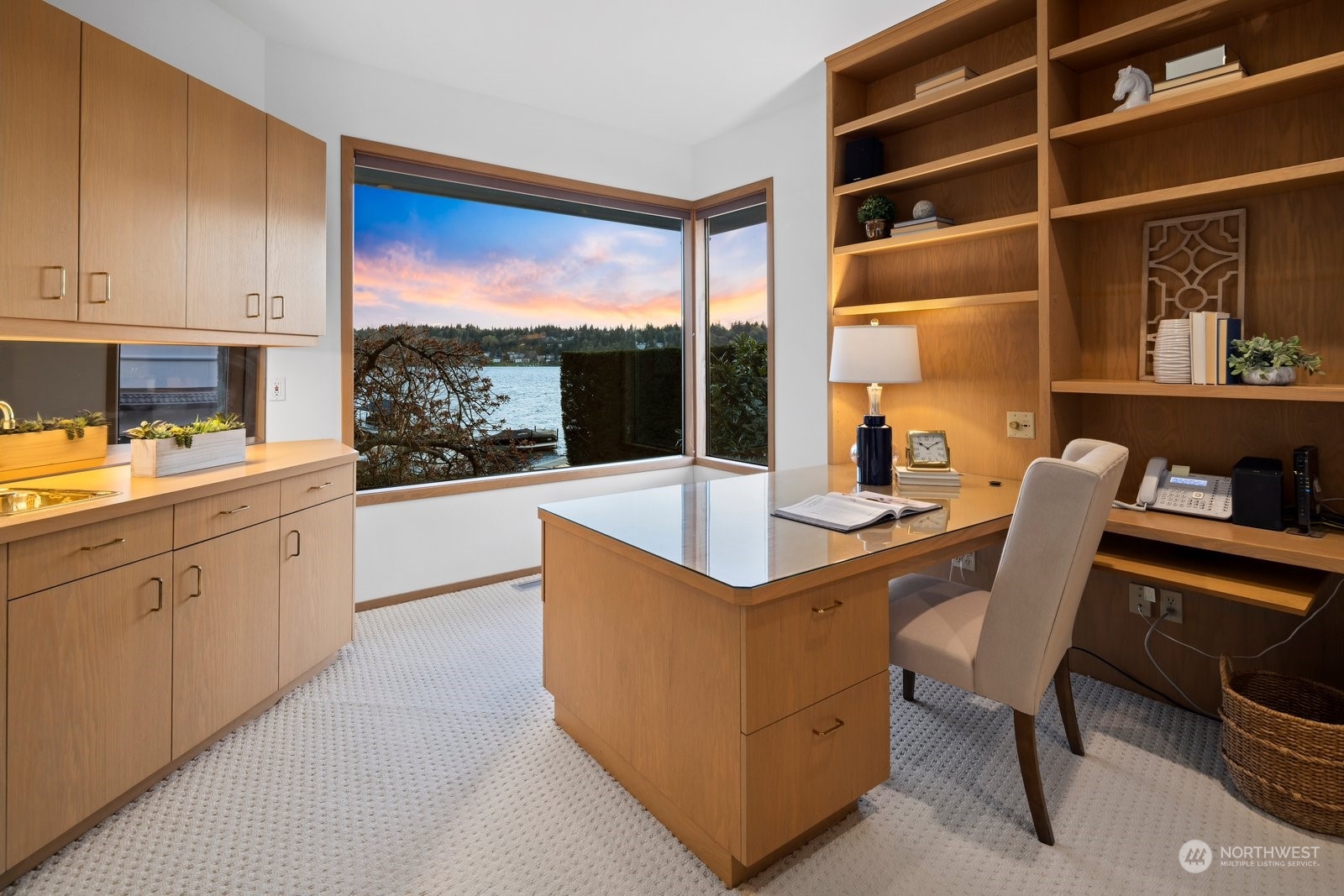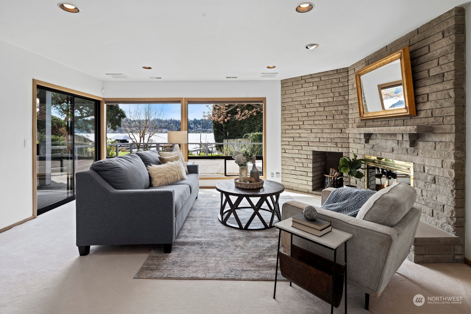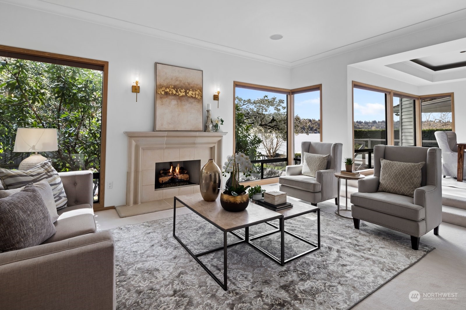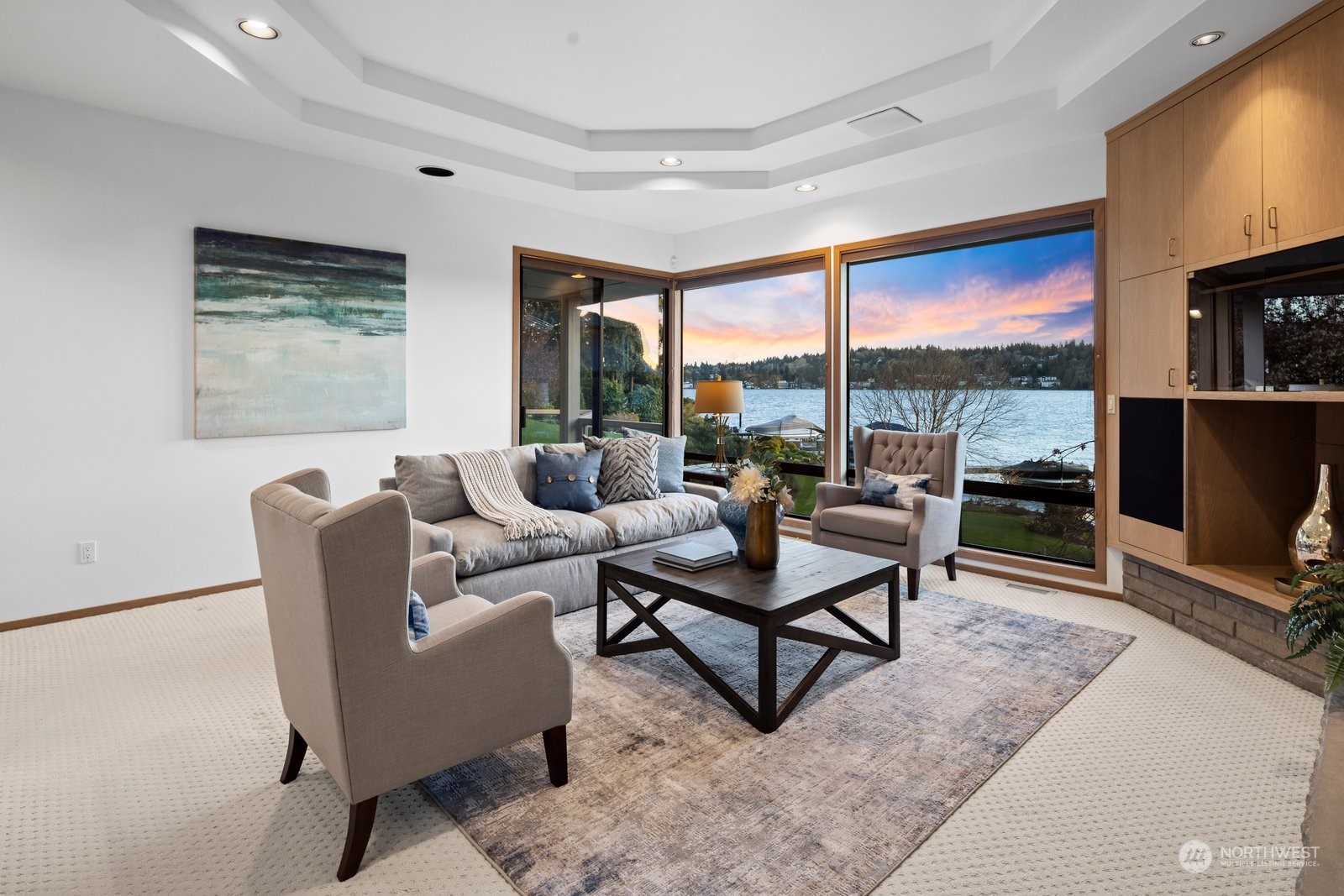 Enjoy refined lakefront living in this Northwest contemporary home built by Design Guild. 43' of prime, southwest facing no-bank waterfront with sandy beach, newer 71' dock w/6,000 lb. boat lift. Expansive windows maximize the light and captivating views. Designed for gathering, the main floor has formal living and dining rooms, open-concept kitchen, family room + den/office. Upper level w/primary suite w/lake views & 5-piece bath. Additional upper level bedroom with 1/2 bath. Daylight lower level w/rec-room, 3 bedrooms, 1.75 baths, media room & 2nd kitchen. 22,276 sf lot w/expansive decks, patio, sport court & lush sprawling lawn. 3-car garage + 4th gar & parking for 10-12 cars. Just minutes to Bellevue, parks, shopping and restaurants.