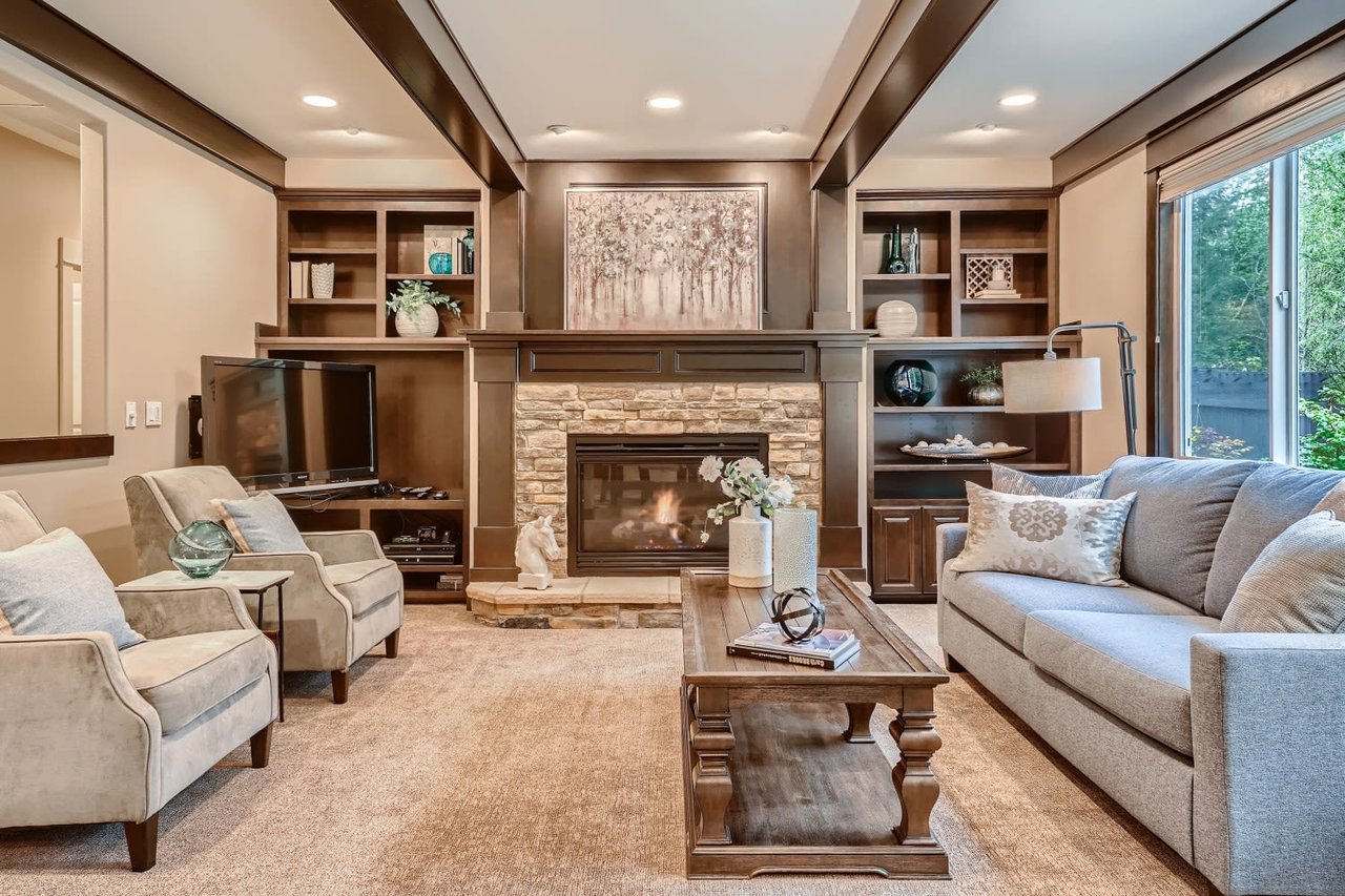 Gorgeous custom Burnstead home in Montaine at Aldarra with high-end finishes throughout! Loaded with upgrades, this Craftsman-style home features a formal dining room, inviting family room with a gas fireplace and custom built-ins, spacious gourmet kitchen with large island with prep sink, butler’s pantry, stainless-steel appliances and eating area. Main floor bedroom with ¾ bath is perfect for guests or home office. Upstairs features bonus room plus 3 additional bedrooms and 2 full baths, including the luxurious primary suite with sitting area with fireplace and built-ins, huge custom closet and spa-inspired bath with dual-sink vanity, tub and separate shower. The backyard is a private retreat with lush landscaping, expansive patio, fenced yard and soothing water feature. Close to community parks and trails, minutes to restaurants and retail and easy I-90 access.